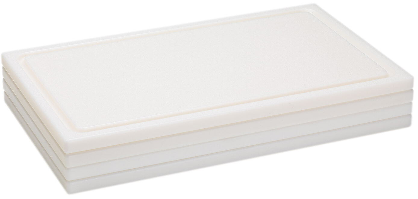 Confezione 4 taglieri in polietilene, misure GASTRONORM, con canalina. Imballati singolarmente con codice EAN. A richiesta, è possibile applicare dei gommini antiscivolo. Un prodotto prettamente professionale.